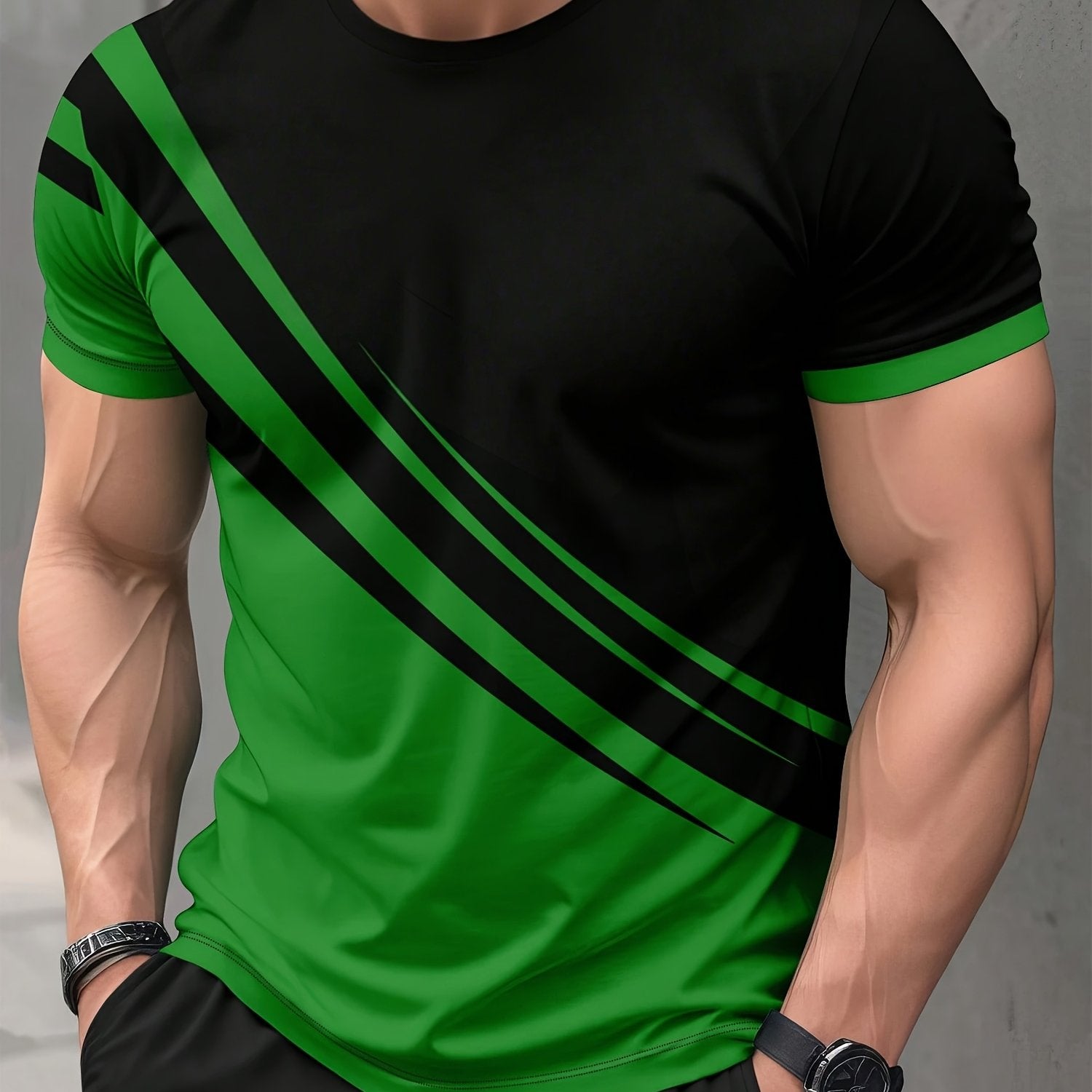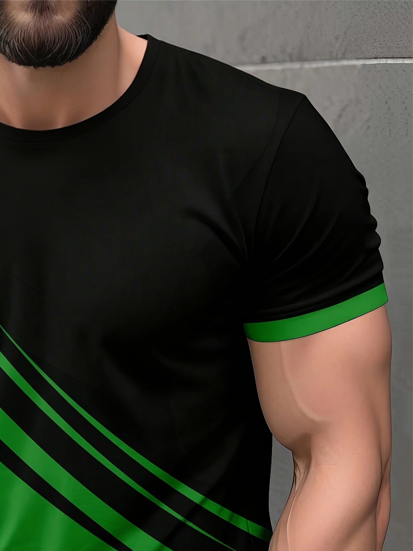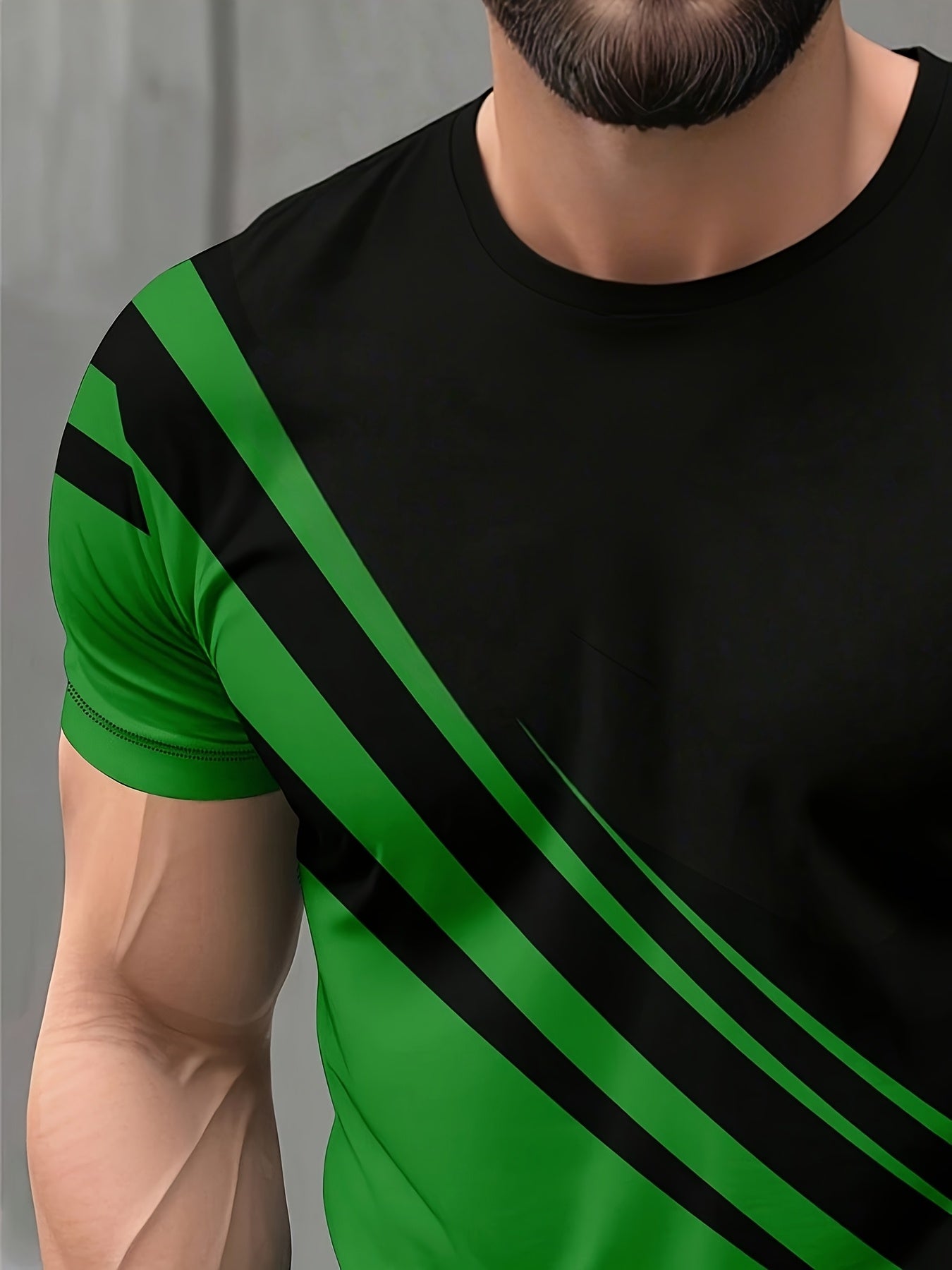 Men'S Casual T-Shirt with Bold Green & Black Striped Design - Breathable Short Sleeve Round Neck Tee,