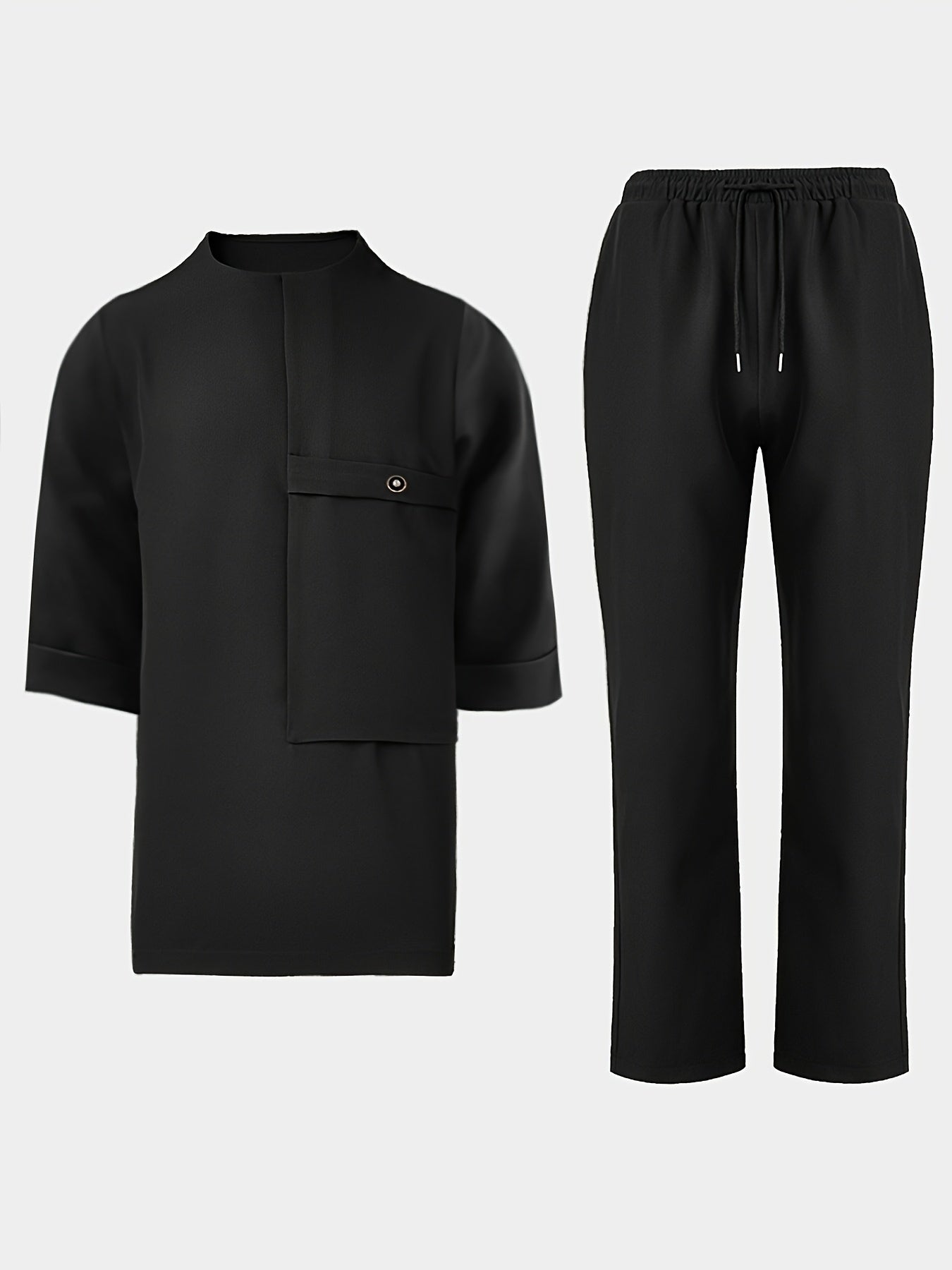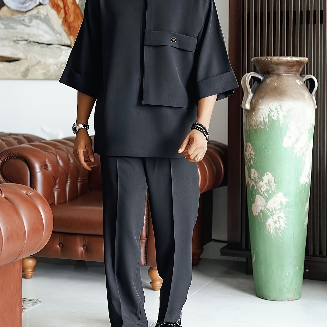 Men'S Suit, Short Sleeve Top, Round Neck, Fake Pocket Design, Hem Slit, Elastic Pants, Plus Size Men'S Suit, Men'S Casual Shirt and Pants Set,